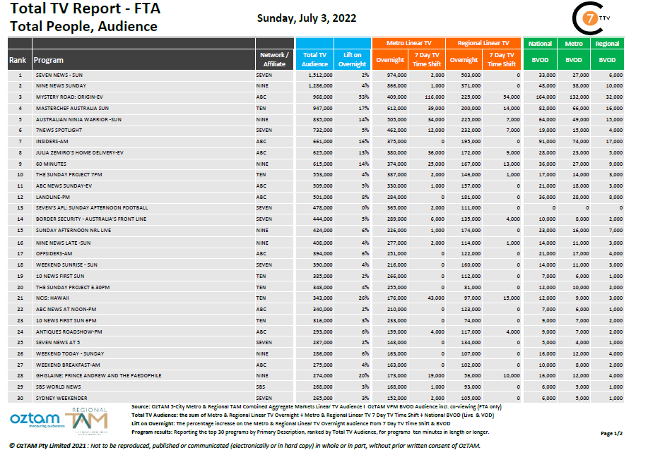 在7月3日的最新每日整合电视报告中,有七个新闻是全国性线性的第一名计划,其中有15.12亿观众,其中包括33,000个BVOD的观众,增长量为2%。本周最大的提升是ABC的“神秘之路”的一集,升高为53%,播出了968,000的观众。