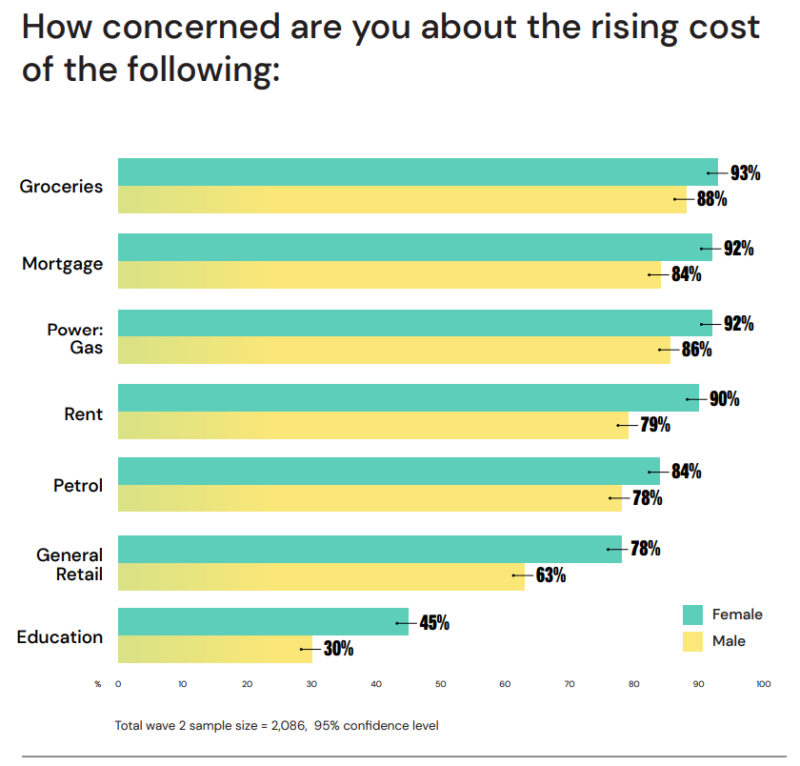 杂货、抵押贷款和电费是两性显示的类别,受访者最担忧的。然而,女性受访者总体更关心所有类别。