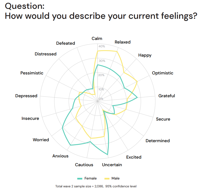 澳大利亚女性比男性感到更加焦虑和担心当前的生活危机,由工资和心理因素,该报告发现。