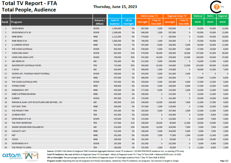 最近每天巩固7报告6月15日,7新闻节目电视观众总数为145.4万和45000在国家BVOD,上升了3%。