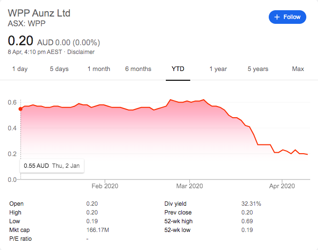 WPP AUNZ的股价下跌至20援息,而今年年初55℃,3月5日。