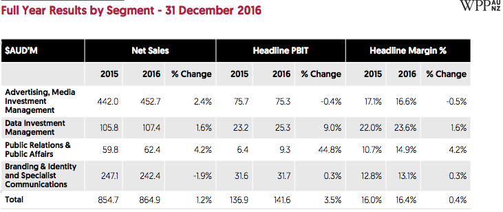 WPP AUNZ破裂的结果部分与公共关系和公共事务——这房子奥美公关、PPR和CanningsPurple——发布的息税前利润增幅最大(PBIT),同比增长44.8%,从6.4美元到9.3美元。