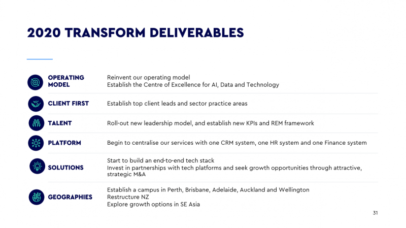 作为2020年交付WPP的一部分,它将建立校园在珀斯,布里斯班和阿德莱德(除了奥克兰、惠灵顿),推出新的领导力模型,建立个人kpi,开始将其服务集中起来,建立一个端到端的技术堆栈,投资于科技平台合作,参与并购,重组新西兰操作和探索东南亚增长选项。