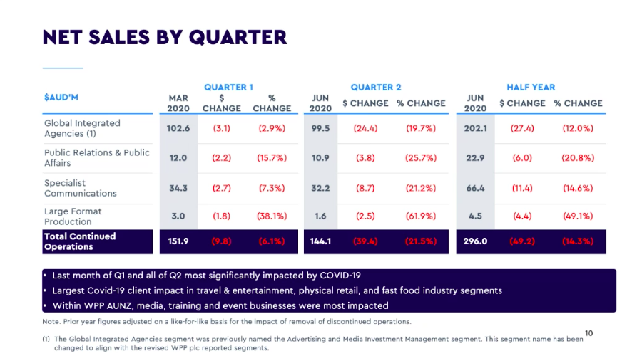 在集团的媒体和创意机构中 - 包括MediaCom,白灰,思维,波浪制造商和Wunderman Thompson - 净销售额下降了12%,因为取消或推迟或客户花费响应Covid-19。
