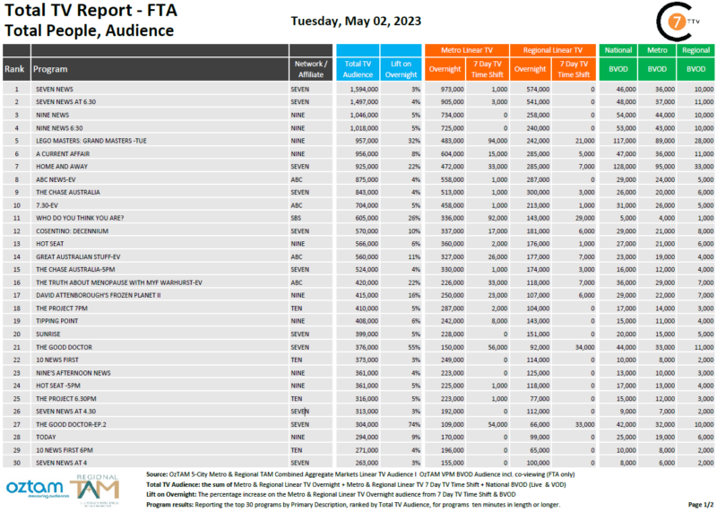 最近每天巩固7总电视报道,5月2日7新闻# 1项目与159.4万年地铁观众上升了3%,和46000年在国家BVOD。