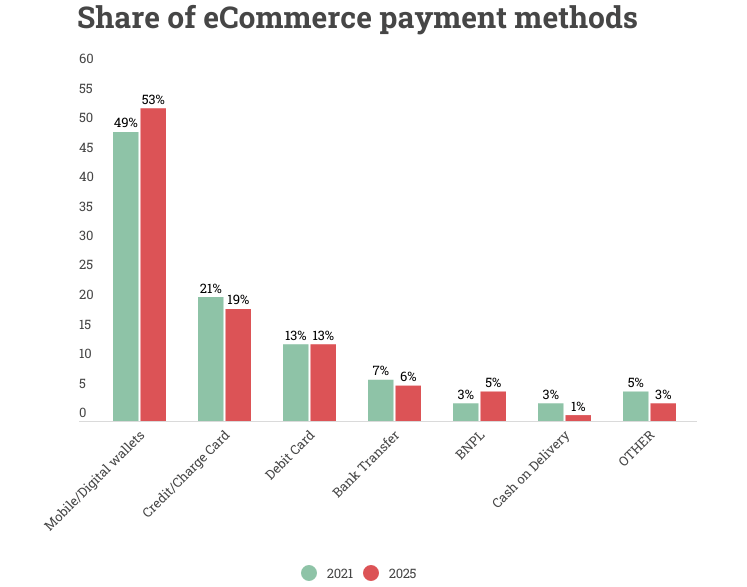 亚太市场一直是移动/数字钱包流行背后的驱动力。2021年,移动/数字钱包占亚太地区电子商务交易量的69%。