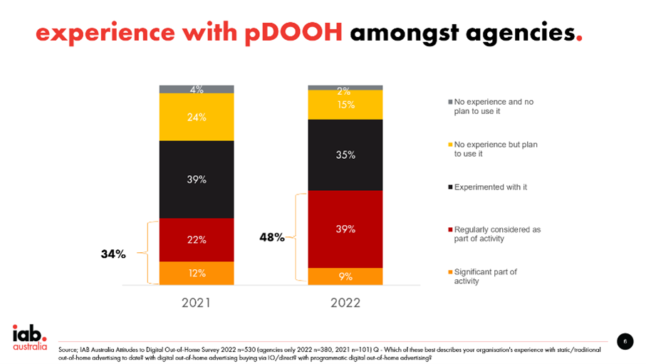 澳大利亚广告公司正在继续拥抱可编程数字户外广告(pDOOH), 83%的机构认为他们使用编程式DOOH, 48%的人说他们经常考虑,根据态度DOOH 2022报告周三公布的澳大利亚IAB到场:哦。