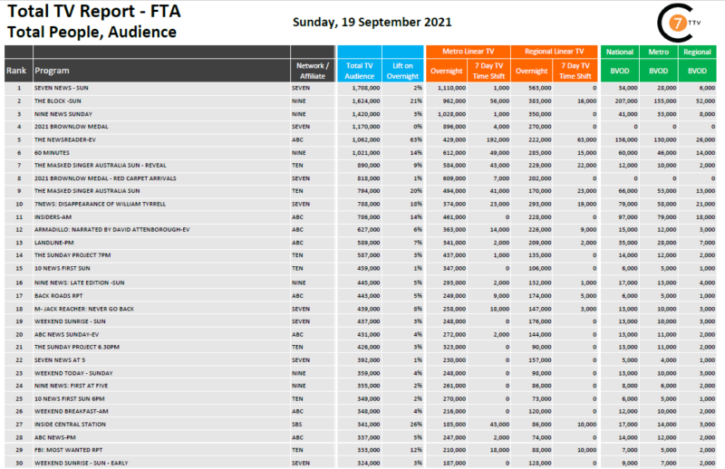 在9月19日最新的每日综合电视总报告中,Seven News是全国线性和BVOD电视节目中排名第一的节目,有179.8万观众,其中BVOD有3.4万观众,上升了2%。
