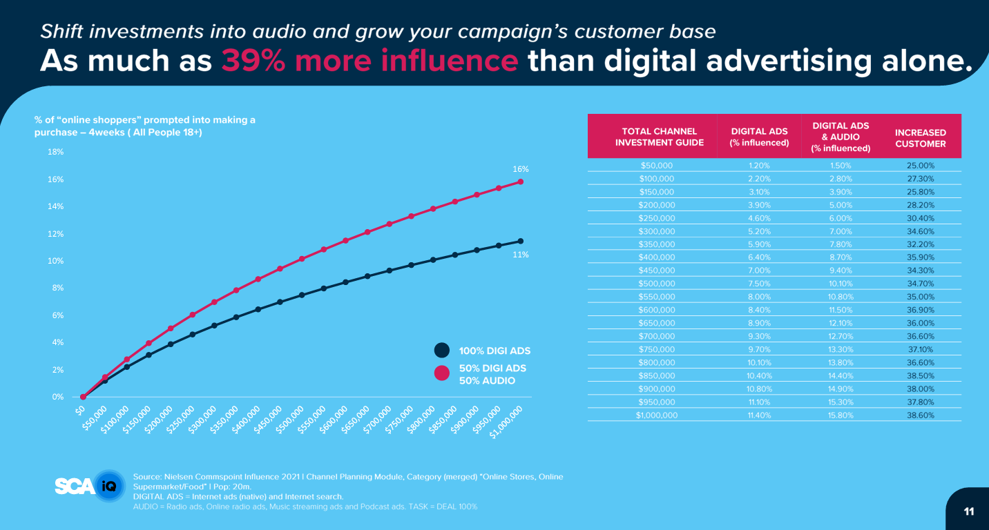 根据SCA洞察部门SCAiQ的一份报告,音频广告已经证明了其在推动商业利益方面的有效性,因为100%的抽样广告都产生了可衡量的消费者行为。