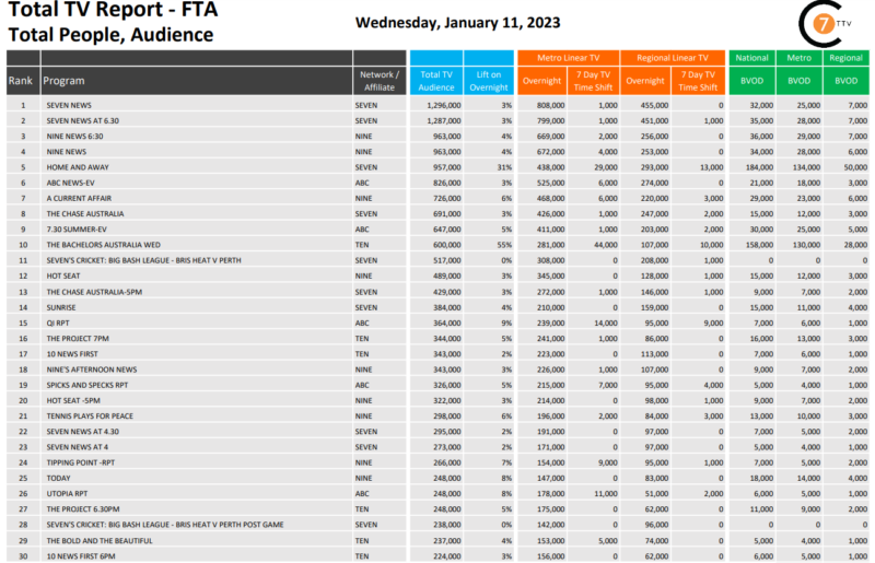 程序最大的提升是十的单身汉周三上升55%,观众总数为600000,和158000年全国BVOD观众。