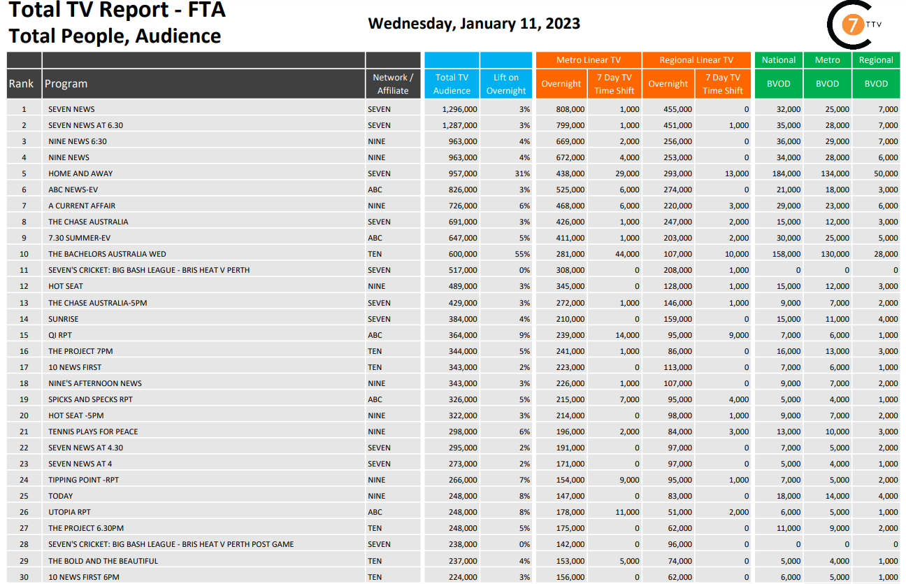 在最新的日常综合总电视报道1月11日,七个消息是在线性# 1计划在全国范围内,有129.6万观众,其中包括32000全国BVOD和3%的提升。