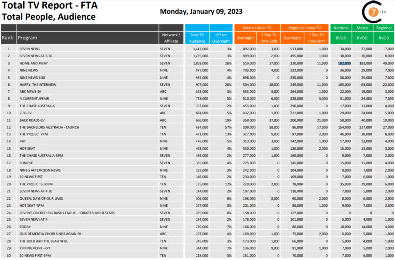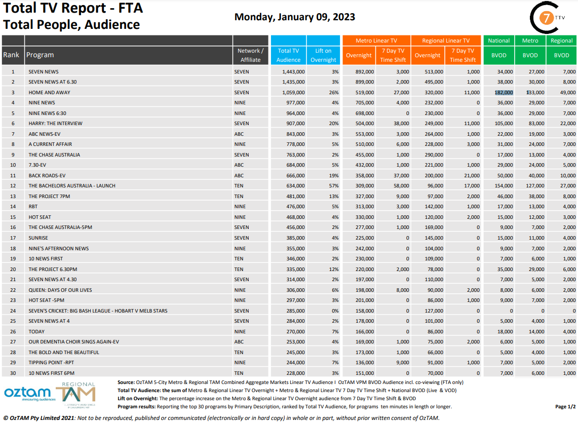 In the latest Daily Consolidated Total TV Report for 9 January, Seven News was the #1 program nationally across linear, with 1.443 million viewers, including 34,000 on BVOD and an uplift of 3%.