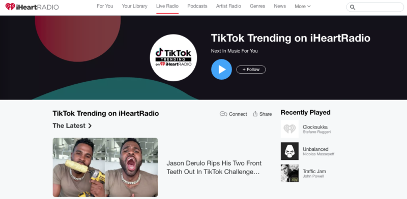 Iheartradio上的Tiktok Trending是作为消费者,品牌和行业球员的进入广播电台,以获得最新的音乐曲目,艺术家和娱乐趋势立即主导Tiktok。