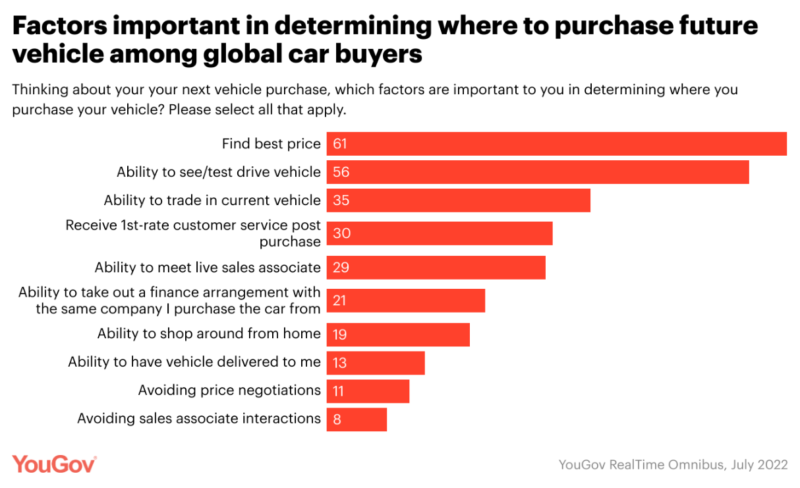 全球购车者中有十分之三(30%)认为售后服务很有吸引力,虽然有相似比例的人欢迎有机会与现场销售人员打交道(29%),但约十分之一的人更愿意避免价格谈判(11%)或与销售人员互动(8%)。