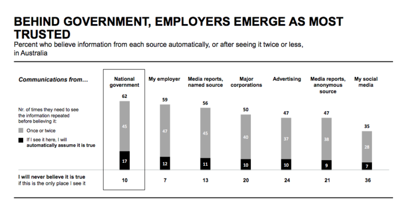 尽管78%的澳大利亚人他们的雇主企业的信任。雇主是最值得信赖的机构之一,排名第二大政府后相信和信任的信息来源。