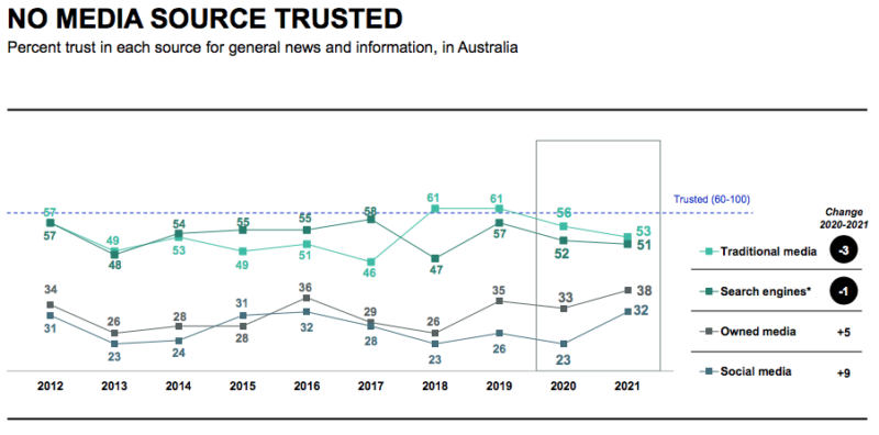 Edelman的2021信任晴雨表的报告显示,没有媒体源由澳大利亚人可信的新闻和信息,与传统媒体体验信任比上年下降3%。