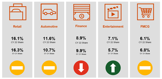 五大广告类别一般广告保持一致,与零售、汽车、快速消费品稳定、娱乐份额略有增加,财政份额略有下降。