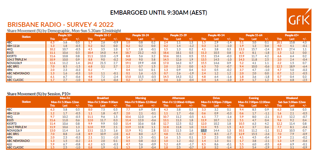 在2022年第四次GfK地铁广播收视率调查中(从4月17日星期日到6月25日星期六),该电台在布里斯班的广播份额又一次大幅上升,比上一本书增加了1.4个百分点,在10岁以上人群中占12.6%的份额,再次保持了第一的位置。