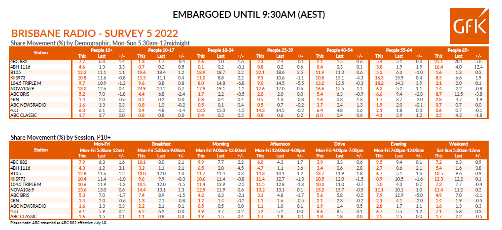 布里斯班电台收视率:NOVA保持领先,Hit Network继续前进