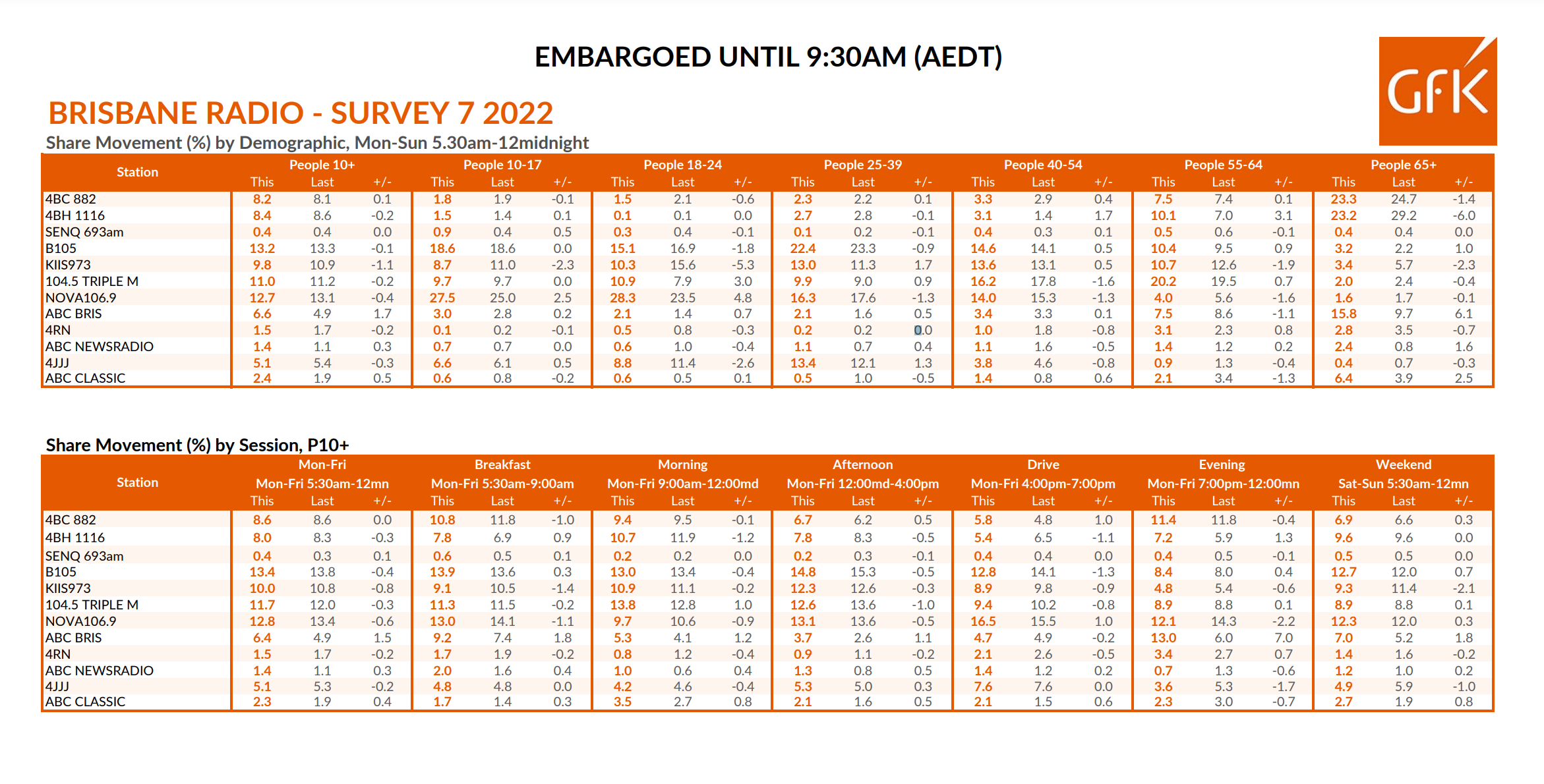 《Triple M》的《与马托和玛尔戈共进早餐》以11.3%的份额位居第三,尽管与上次调查相比略有下降0.2个百分点。《与劳雷尔·加里和马克共进早餐》在9台4BC的最后一本书中获得了1.0个百分点的份额,占10.8%。KISS 97.3的早餐市场份额下降了1.4个百分点,达到9.1%,落后于ABC布里斯班,后者在上一本书中大幅上升了1.8个百分点,达到9.2%。