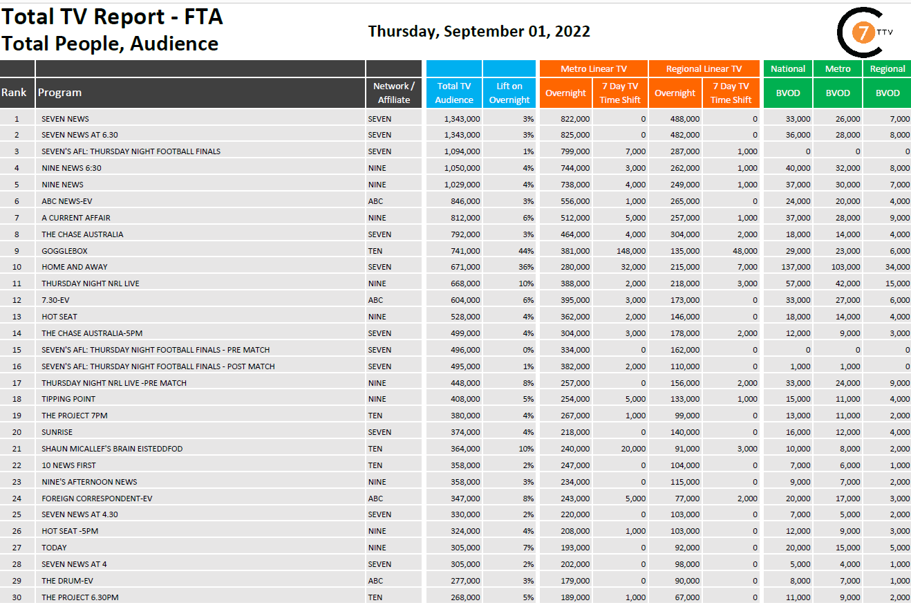 在9月1日最新的每日综合电视总报告中,周四播出的《Seven News》是全国收视第一的节目,有134.3万观众,其中BVOD有3.3万观众,同比增长3%。Gogglebox on Ten的收视率上升幅度最大,达44%,共有74.1万名观众观看。