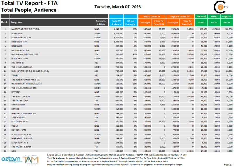 在最新的日常综合3月7总电视报道7,结婚九上周二乍一看是# 1项目全国电视观众总数为184.5万,其中包括597000 BVOD和最大的提升62%。