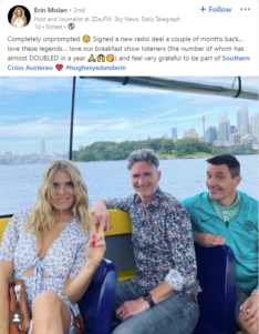 “爱我们的早餐节目听众(他们的人数在一年内几乎翻了一番),非常感谢能成为南十字星澳大利亚电台的一员❤️#hughesyedanderin,”她补充道。