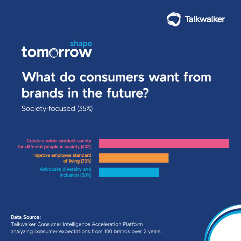 超过三分之一(35%)的相互作用被发现society-focused与消费者最关心品牌是如何创建一个更广泛的产品种类对不同的人(50%)、改善员工的生活水平(30%),和提倡多样性和包容性(20%)。