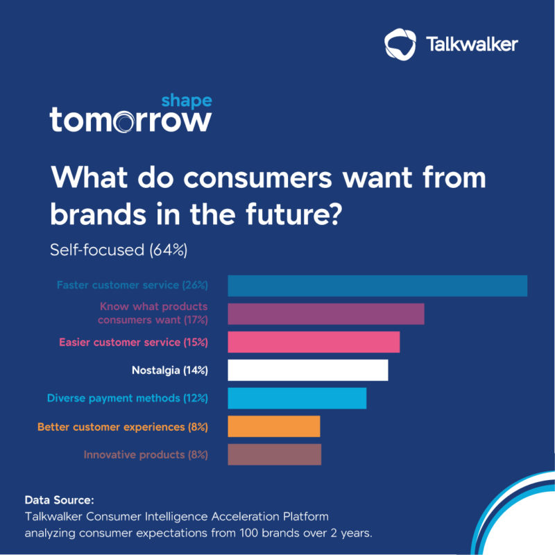 绝大多数(64%)的对话是自我最常见的这类消费者的期望是更快的客户服务(26%),了解消费者的需求(17%),和客户服务(15%)。