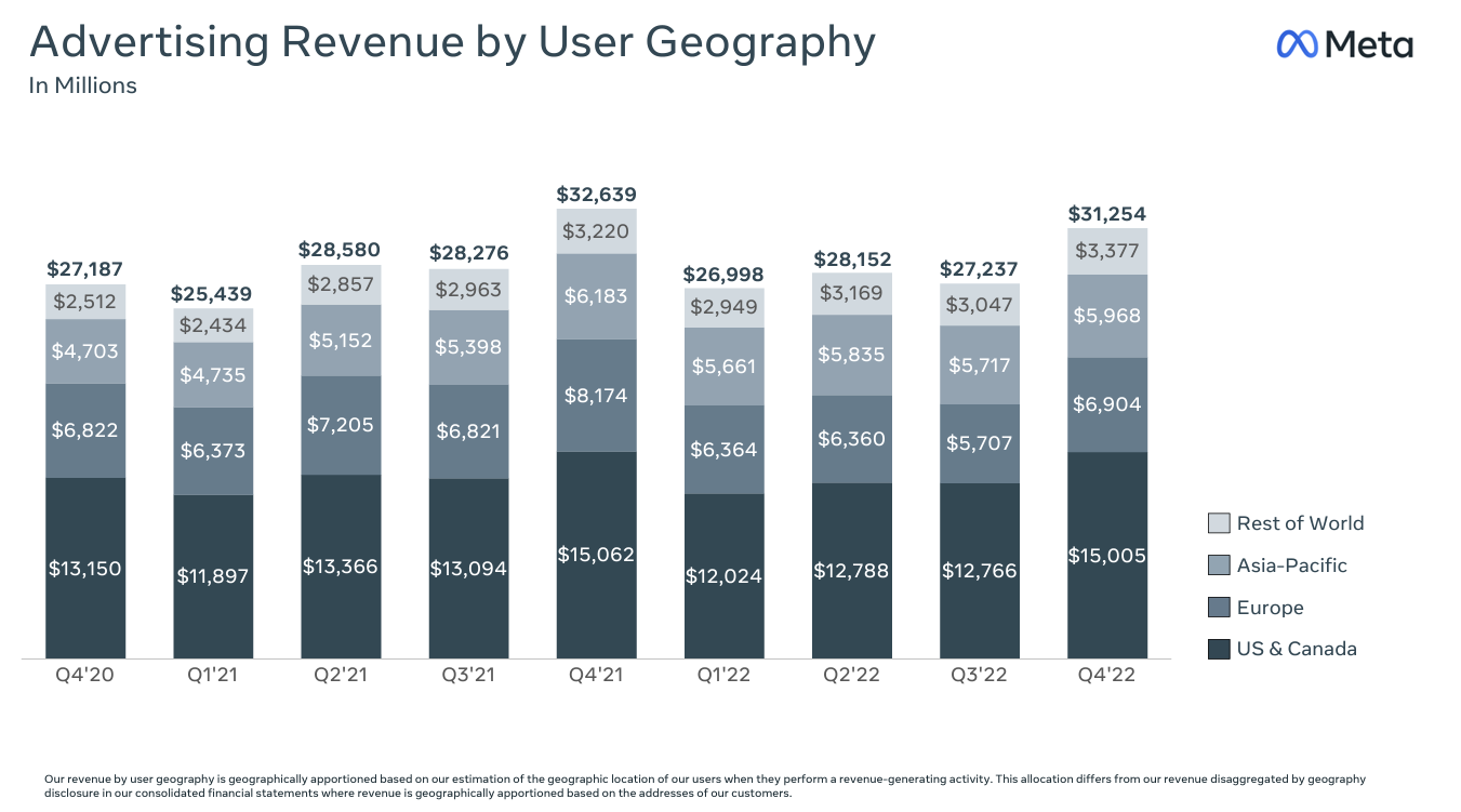 Meta的主要收入来源——广告收入在大部分地区同比都有所下降。在第四季度312亿澳元(437亿澳元)的广告收入中,亚太地区的广告收入占59亿澳元(82亿澳元)。