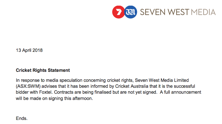 ASX的声明——这是在上午10点——在经历了数周的谈判板球澳大利亚和澳大利亚广播公司。