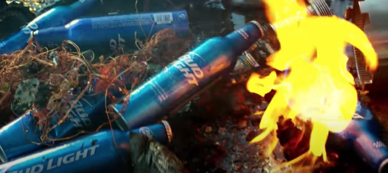 我们的男主角马克·沃尔伯格(Mark Wahlberg)满身油污,满身灰尘,还因为炸毁了他的机器人克星而大汗淋漓。于是他打开了一瓶百威淡啤。泡沫从瓶子里炸了出来。马克喝了一半,然后把瓶子摔在地上。