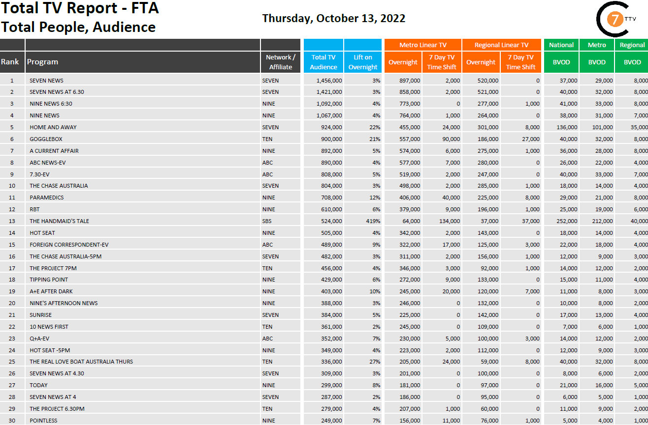 在10月13日最新的每日综合电视总报告中,Seven News是全国排名第一的节目,有145.6万观众,其中BVOD有3.7万观众,上升了3%。SBS的《使女的故事》收视率上升最多(419%),共有53.4万名观众收看,BVOD的观众为24.8万名。