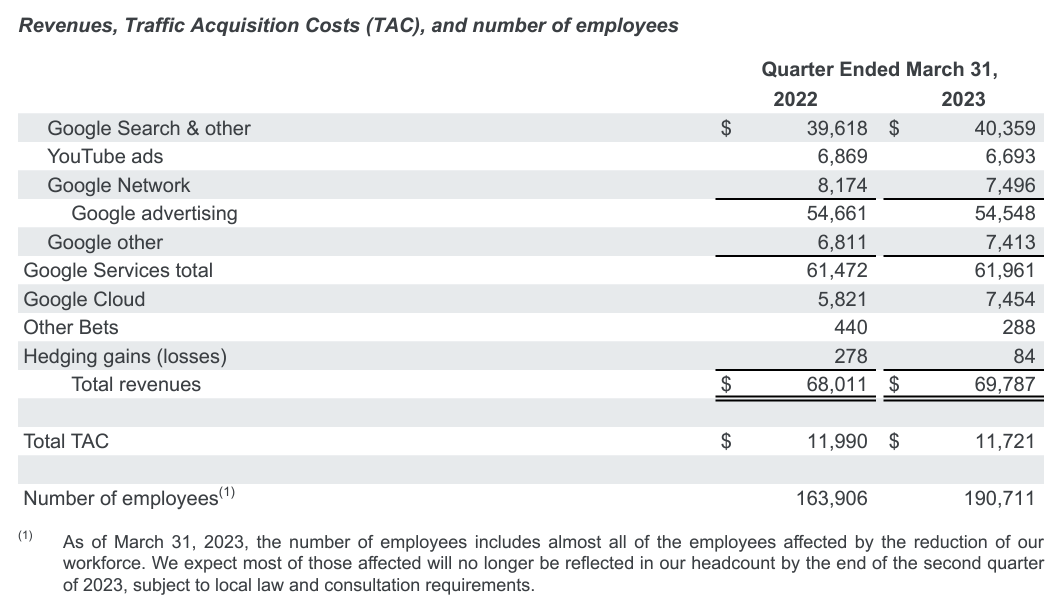 谷歌的母公司字母贴了697.8亿美元(1051.8亿美元)增加收入(上升了3%),但13.8亿美元(20.8亿美元)下降在2023年第一季度的利润,26亿美元(39.1亿美元)后劳动力减少和办公成本。