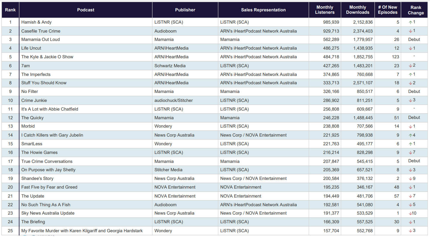 排在第三位的是Mamamia的《Mamamia Out Loud》,它是在本月以52档原创节目加入播客排行榜后首次亮相的。本月26期节目吸引了562289名听众,1779957名听众。