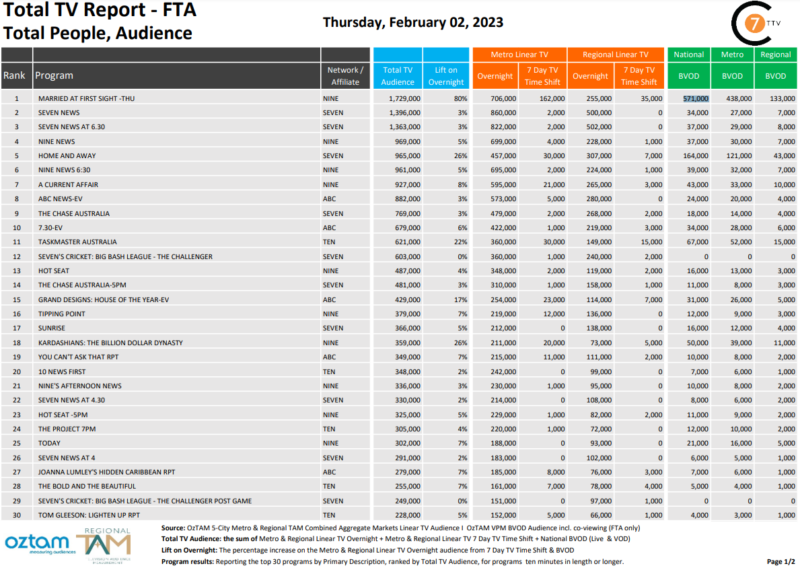 周四晚上排名第一的节目是六点半播出的《七大新闻》(Seven News),地铁观众71.4万人,其次是六点半播出的《七大新闻》(Seven News),观众70.5万人,《九新闻》(Nine News),观众66.4万人,观众65.8万人。