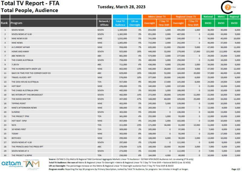 在3月28日最新的每日综合电视总报告中,Seven News以138.9万总电视观众成为全国收视第一的节目,其中BVOD有3.8万观众,同比增长3%。