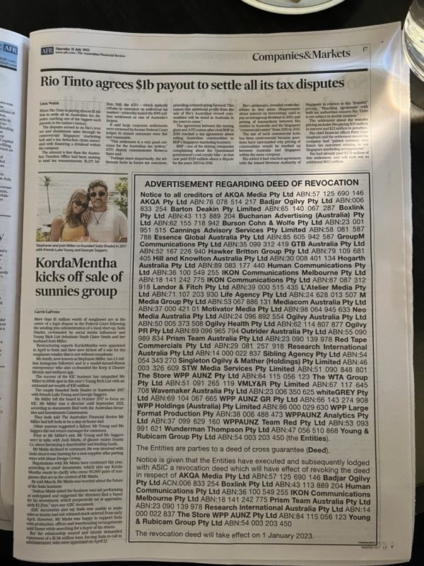 在今天的澳大利亚财务评论中闪烁,穆博博士的右脸颊上出现了泪水,因为WPP宣传了计划已撤销的遗产品牌Young&Rubicam Group,Akqa Media,Ikon Media,Ikon Communications,Badjar Ogilvy等的撤销契据。