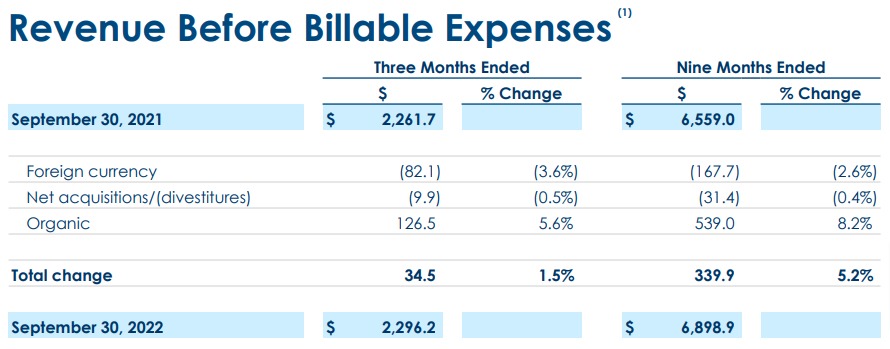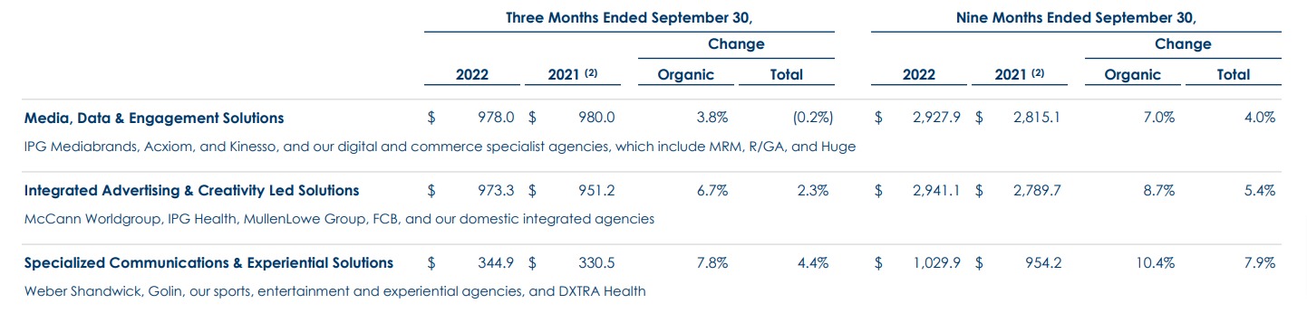 Interpublic Group Mediabrands (IPG)发布了其2022年第三季度和前九个月的业绩,显示净收入为23亿美元(35.9亿澳元),同比增长1.5%,有机增长5.6%。