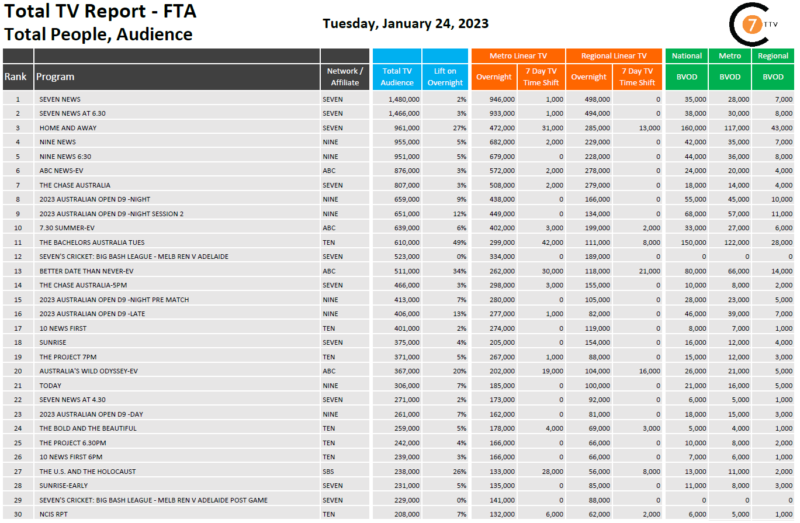 在1月24日最新的每日综合电视总报告中,Seven News是全国收视率第一的节目,有148万观众,其中包括3.5万BVOD观众,同比增长2%。