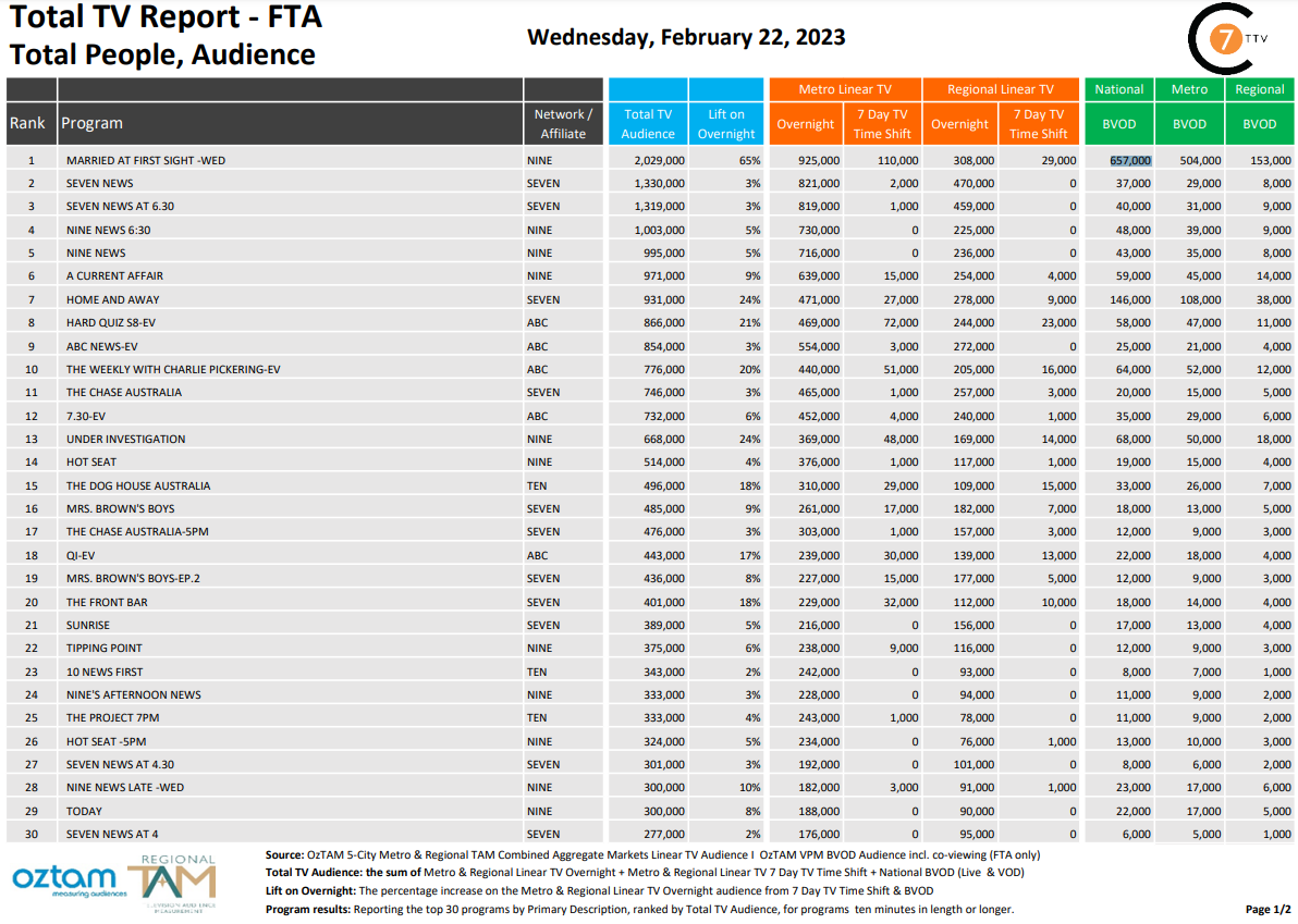 在2月22日最新的每日综合电视总收视率报告中,《MAFS》上周三以20.29亿电视总观众位居全国第一,其中BVOD观众65.7万,增幅最大,达到65%。