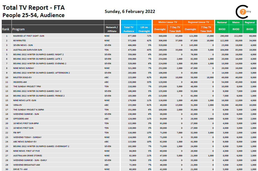 在最新的日常综合总电视报道2月6日,周日的集加是在线性# 1计划在全国范围内,有168万观众,其中包括428000 BVOD和49%的提升。这个项目最大的提升是ABC的召集狗上涨62%。