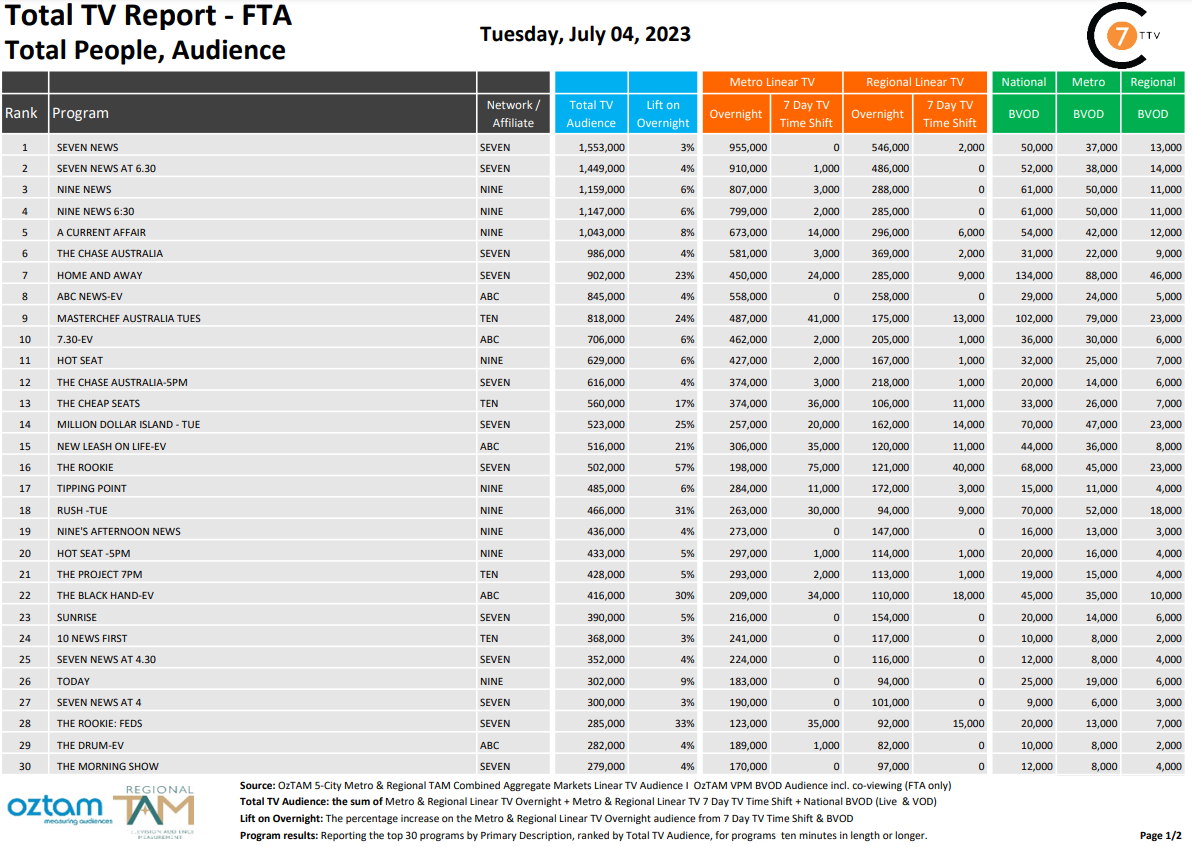 最近每天巩固7对7月4日报道,七个最大隆起的新秀57%的电视观众总数为502000和68000年国家BVOD。