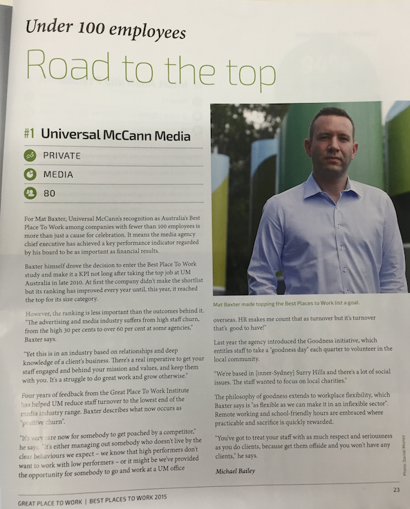 媒体机构嗯是澳大利亚最好的职场员工少于100年,一项调查由费尔法克斯BRW发现出版。