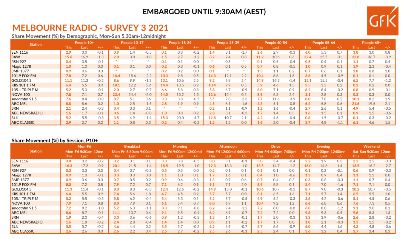 墨尔本电台收视率:3AW仍然无与伦比,杰斯和PJ结束在一个高