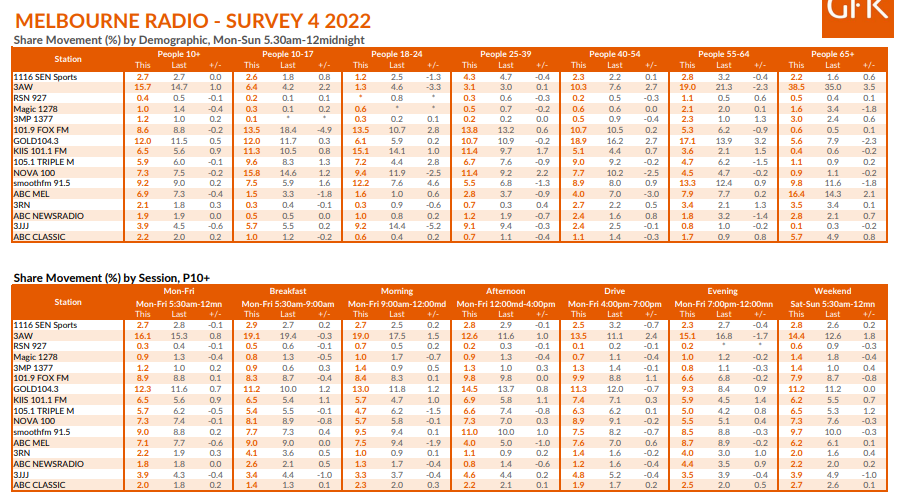 Nine Radio的3AW -在2020年和2021年迎来了丰收,这在一定程度上归功于持续的新冠肺炎限制-是今年第四次调查中涨幅最大的,总共上升了一个百分点,总体份额达到15.7%,早餐组合拉塞尔和罗斯仅下降了0.3个百分点,份额为19.1%。