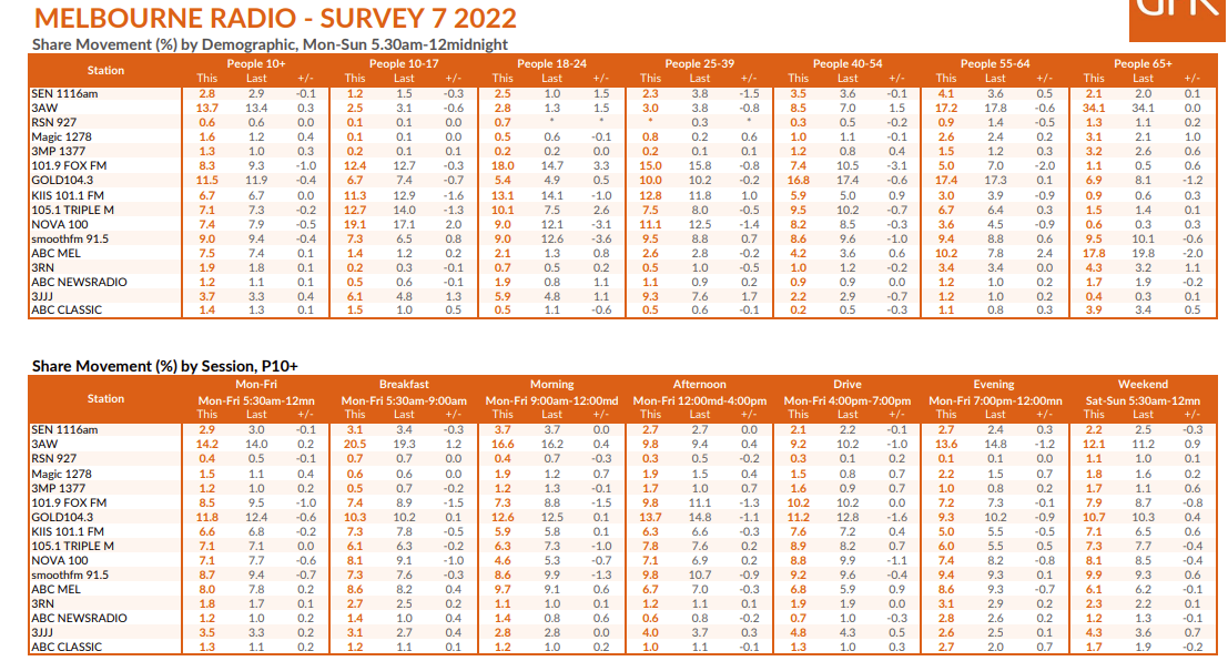 墨尔本电台收视率:墨尔本市场保持稳定,3AW建立了不同于悉尼姐妹电台的份额