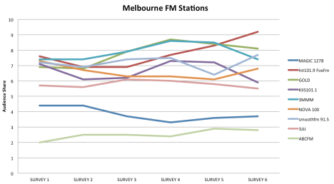 上周的收视率调查是这样的墨尔本的Kiis排名第六在调频音乐排行榜上,有全国内容总监邓肯•坎贝尔声明“我们对Kiis在墨尔本的表现感到失望,我们的金牌排名第二,但Kiis101.1FM今年的表现没有达到预期。