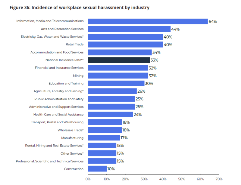 在贸易媒体上周的一份报告中,澳大利亚媒体行业再次成为性骚扰的榜首,马登说:“重要的是要注意,根据报告,澳大利亚机构的性骚扰发生率明显低于全国平均水平(15%对33%)”,并澄清机构被归类为“专业、科学和技术服务”部门,而不是“媒体、信息和电信部门”。