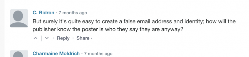 一个流行的观点是坚持评论者或提供电子邮件地址登录。但我们知道两件事。首先,这很容易伪造的。蒂姆证明它之前,创建一个虚假的电子邮件和c .名义发布Ridron Adnews文章。其次,一些人当他们被迫提供额外的细节发表评论。